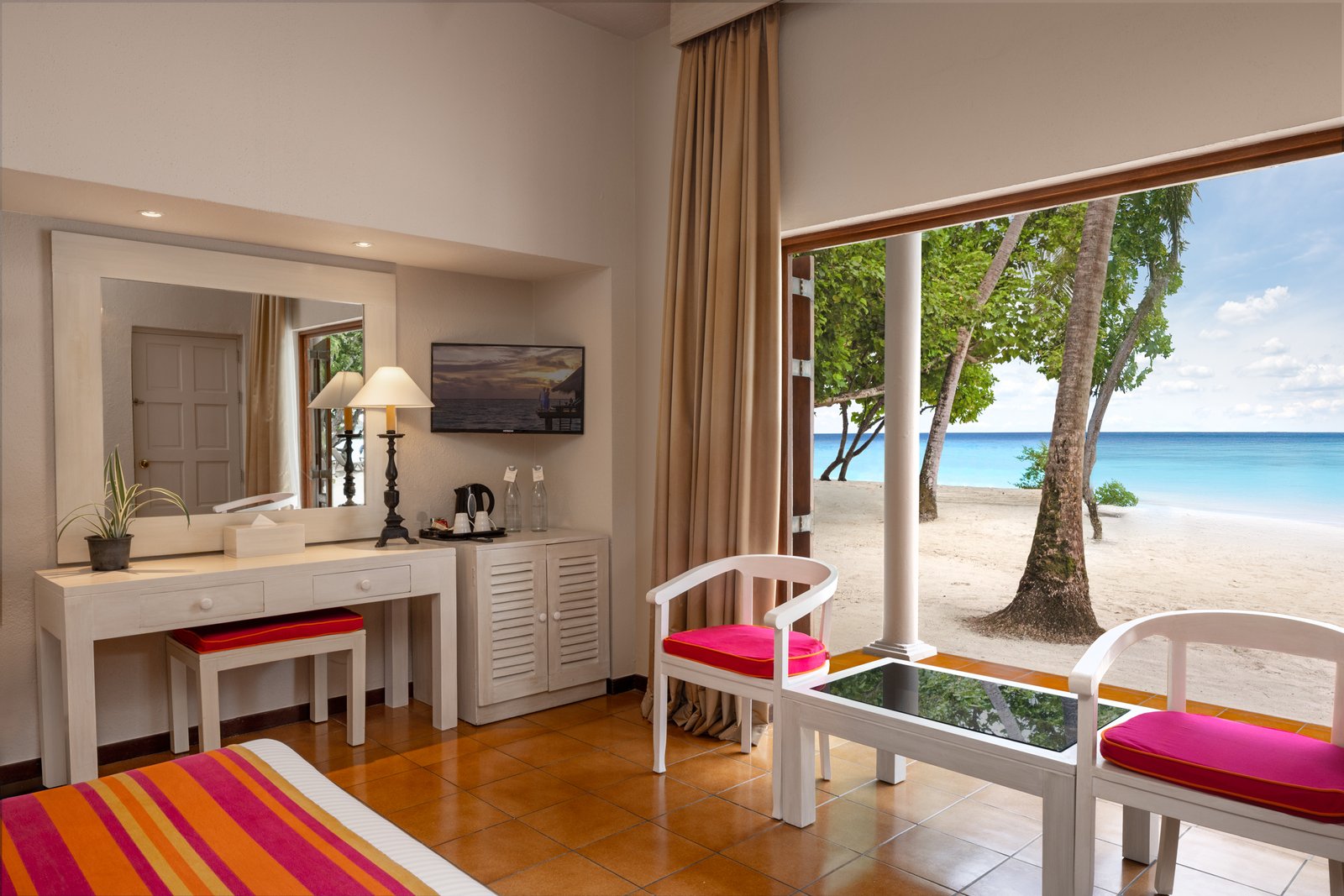 - Amenities: Balcony or Terrace with Ocean or Garden View, Bathroom essentials, Beachfront, Bedroom comforts, Ensuite Bathrooms, Free Excursions for Stays Above 5 Nights, Hair dryer, In-room Safe, Individual Controlled Air-Conditioning, Satellite Television (LCD), Snorkeling Equipment Throughout the Stay, Tea/Coffee Making Facilities, Telephone with IDD Facility, Two Sunbeds, Walk-in Wardrobe, Wi-Fi