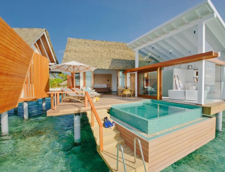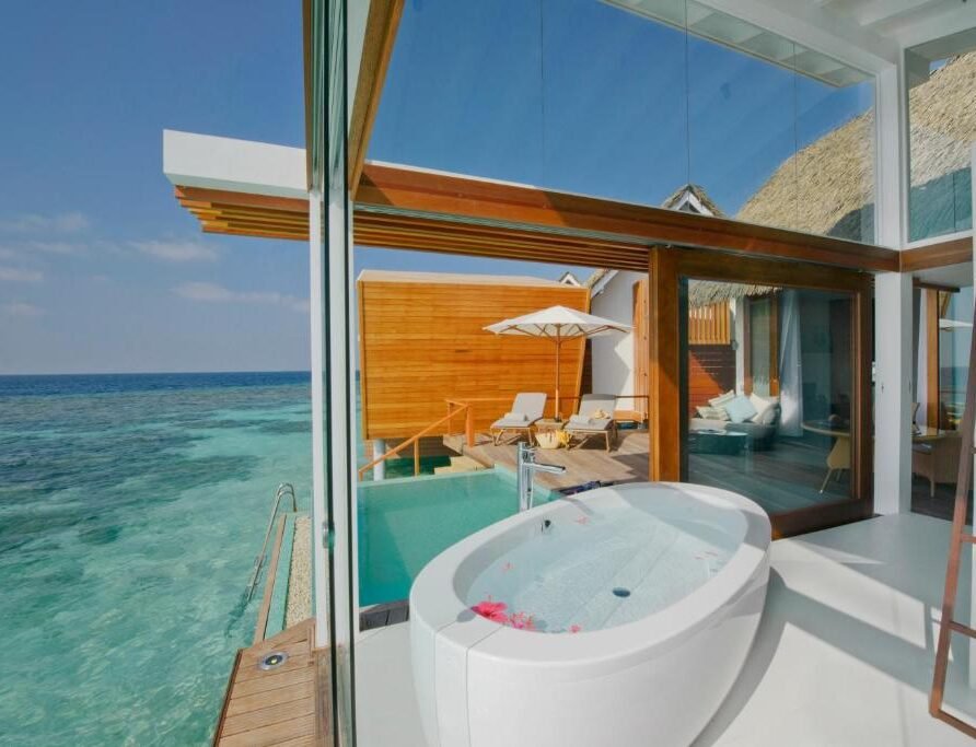 - Amenities: Bathrobe, Bathroom essentials, Bathtub & Shower, Bedroom comforts, Double Vanity, Dressing Room, Drinking Water Bottles, Ensuite Bathrooms, FITNESS CENTER, Hair dryer, In Room Desk, In-room Safe, Individual Controlled Air-Conditioning, LOCATION-OVERWATER, , Outdoor Rain Shower, Outdoor Sitting Area, Private Patio, PRIVATE POOL, Robe & Slippers, Satellite Television (LCD), Semi Open Air Bathroom, Sitting Area, Smart TV, Standalone Tub, Tea/Coffee Making Facilities, Telephone with IDD Facility, Terrace, Wardrobe, Wi-Fi, Wooden Ladder from the Sun Deck for Private Access to Surrounding Ocean