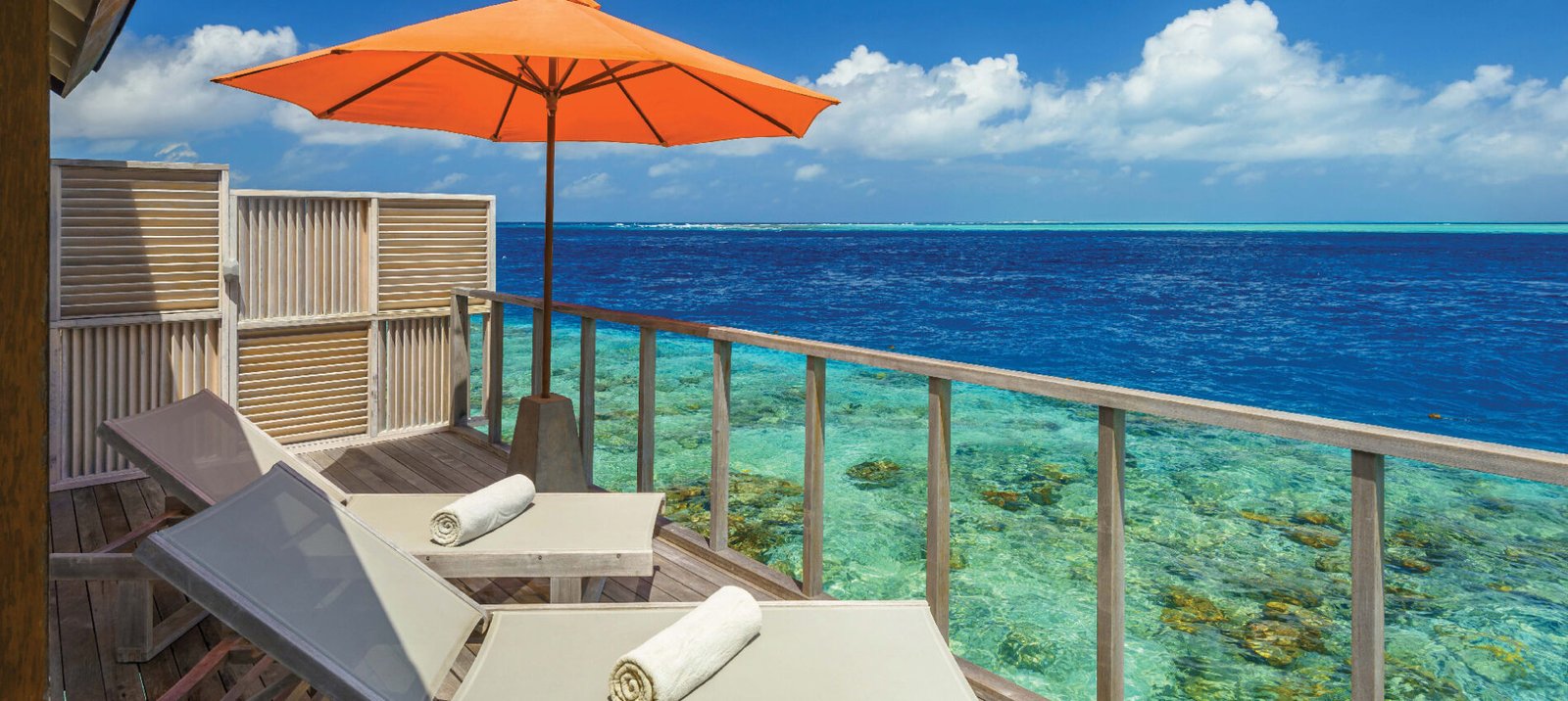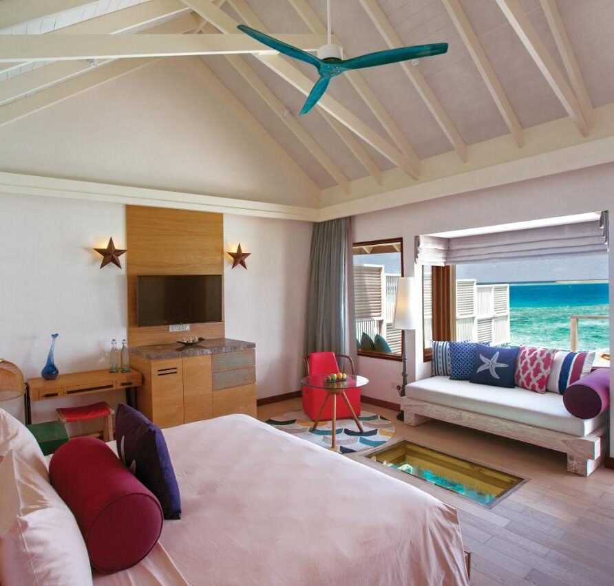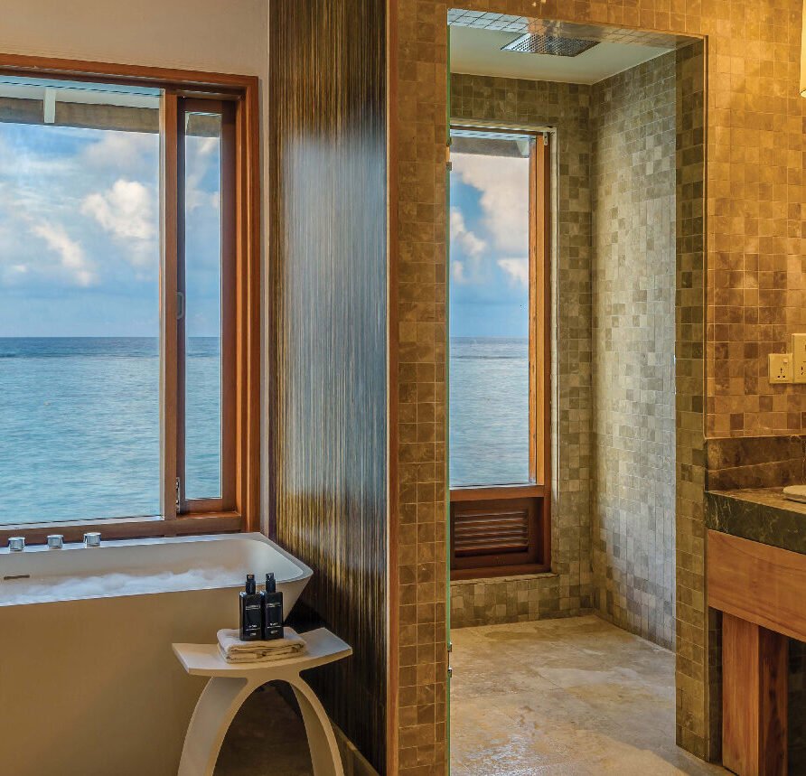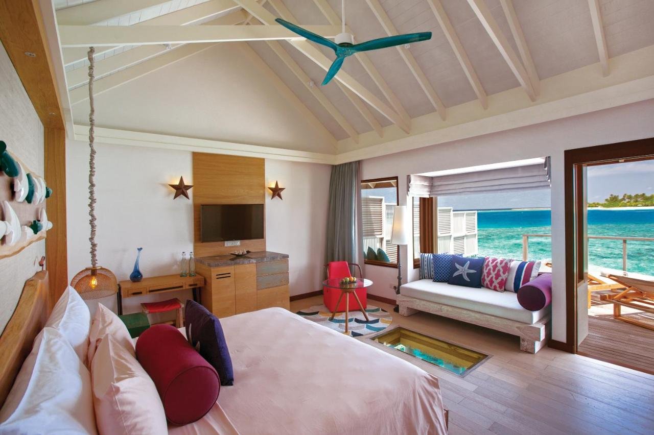 - Amenities: Bathrobe, Bathroom essentials, Bathtub & Shower, Bedroom comforts, Bedside charging stations, Double Vanity, Drinking Water Bottles, Ensuite Bathrooms, FITNESS CENTER, Free In Room Mineral Water, Hair dryer, In-room Safe, Individual Controlled Air-Conditioning, Iron & Ironing Board, KIDS CLUB, LOCATION-OVERWATER, Marine Center, , Robe & Slippers, Satellite Television (LCD), Tea/Coffee Making Facilities, Telephone with IDD Facility, Terrace, Wardrobe, Wi-Fi, Wooden Ladder from the Sun Deck for Private Access to Surrounding Ocean