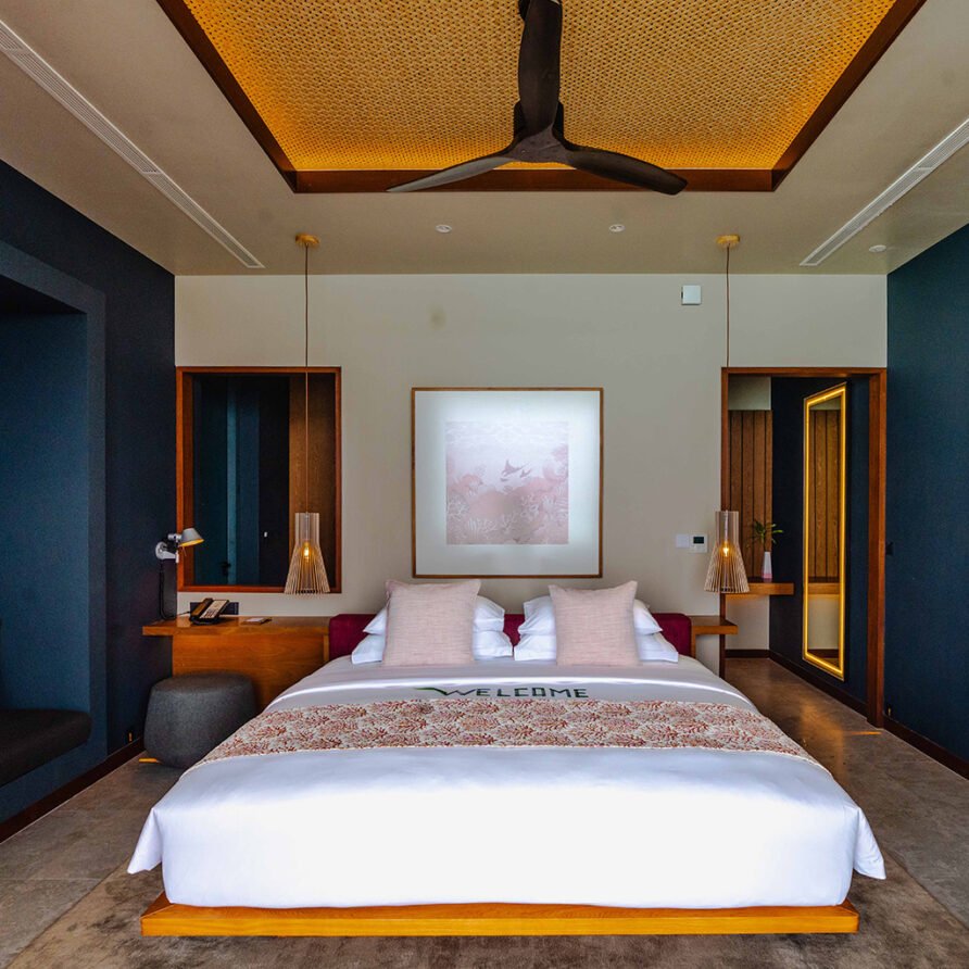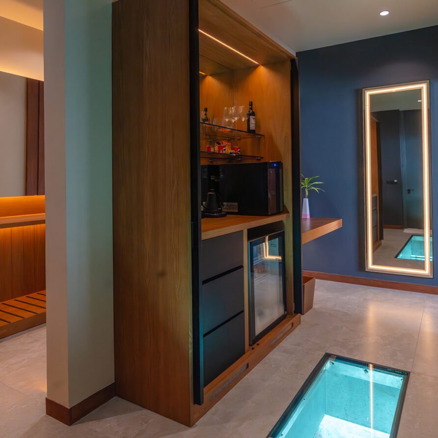 - Amenities: Bathrobe, Bathroom essentials, Bathtub & Shower, Bedroom comforts, , Celling to floor glass doors, Double Vanity, Dressing Room, Drinking Water Bottles, Emergency torchlight, Ensuite Bathrooms, FITNESS CENTER, Game Room, Glass Bottom Table, Hair dryer, In-room Safe, Individual Controlled Air-Conditioning, Life jackets, LOCATION-OVERWATER, , Motorized curtains with wireless remote, Nespresso Coffee Machine, Outdoor Rain Shower, Plunge Pool, Private Patio, PRIVATE POOL, Remote controlled motorized roller blinds, Robe & Slippers, Satellite Television (LCD), Semi Open Air Bathroom, Sitting Area, Smart TV, Standalone Tub, Tea/Coffee Making Facilities, Telephone with IDD Facility, Terrace, Two Sunbeds, Wardrobe, Wi-Fi, Wooden Ladder from the Sun Deck for Private Access to Surrounding Ocean