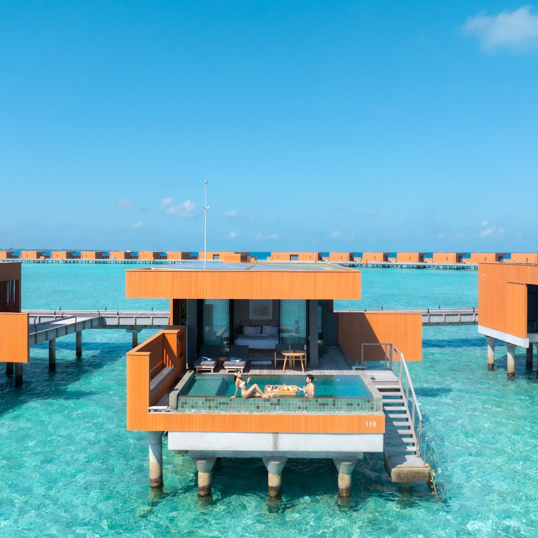 - Amenities: Bathrobe, Bathroom essentials, Bathtub & Shower, Bedroom comforts, , Celling to floor glass doors, Double Vanity, Dressing Room, Drinking Water Bottles, Emergency torchlight, Ensuite Bathrooms, FITNESS CENTER, Game Room, Glass Bottom Table, Hair dryer, In-room Safe, Individual Controlled Air-Conditioning, Life jackets, LOCATION-OVERWATER, , Motorized curtains with wireless remote, Nespresso Coffee Machine, Outdoor Rain Shower, Plunge Pool, Private Patio, PRIVATE POOL, Remote controlled motorized roller blinds, Robe & Slippers, Satellite Television (LCD), Semi Open Air Bathroom, Sitting Area, Smart TV, Standalone Tub, Tea/Coffee Making Facilities, Telephone with IDD Facility, Terrace, Two Sunbeds, Wardrobe, Wi-Fi, Wooden Ladder from the Sun Deck for Private Access to Surrounding Ocean